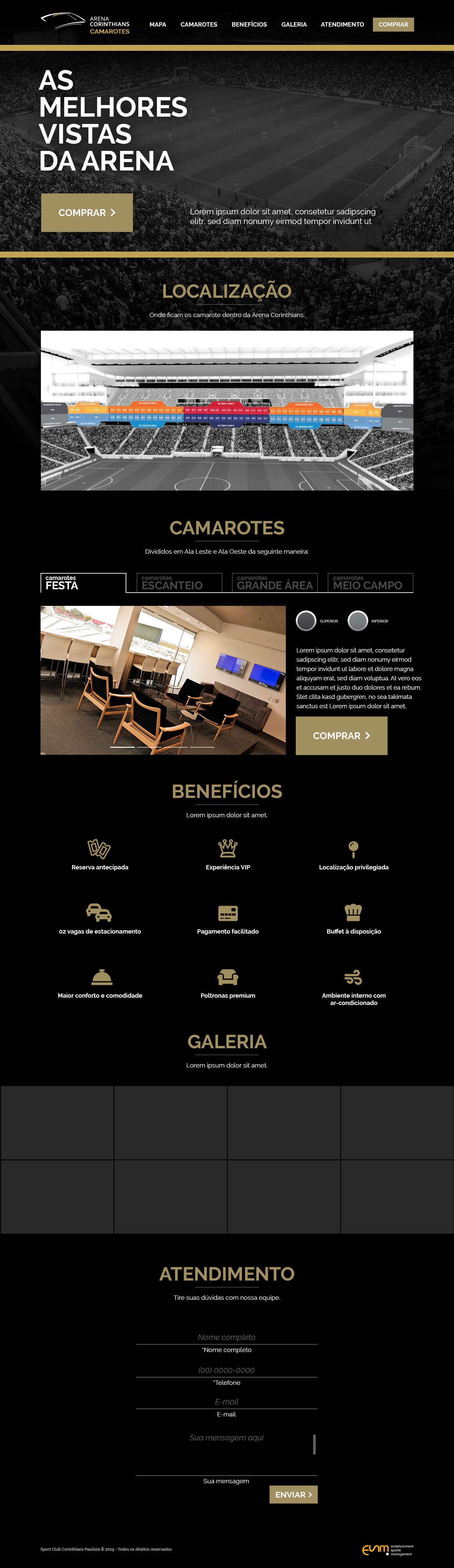 UX / UI do Hotsite Camarotes da Arena Corinthians com venda pela internet. Processo de compra online com escolha do camarote no mapa da Arena e escolha de itens extras complementam a venda.