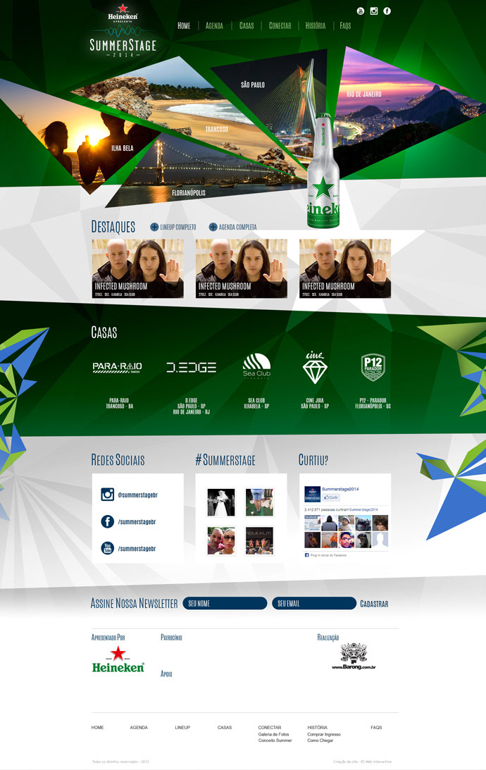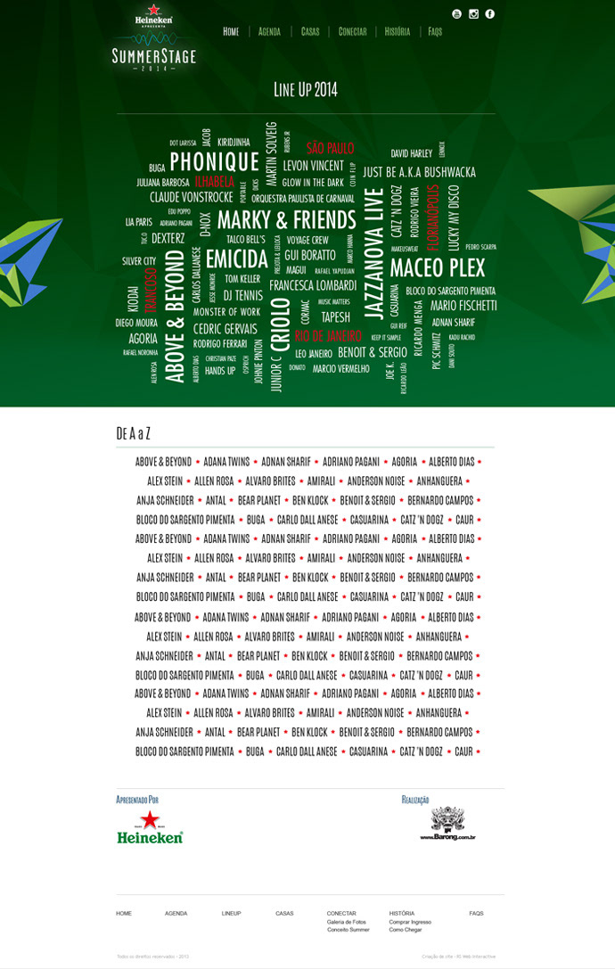 Criação de site para o evento Heineken SummerStage 2014, que acontece em 5 casas de diferentes cidades. O layout segue a comunicação da Heineken para as garrafas de alumínio.